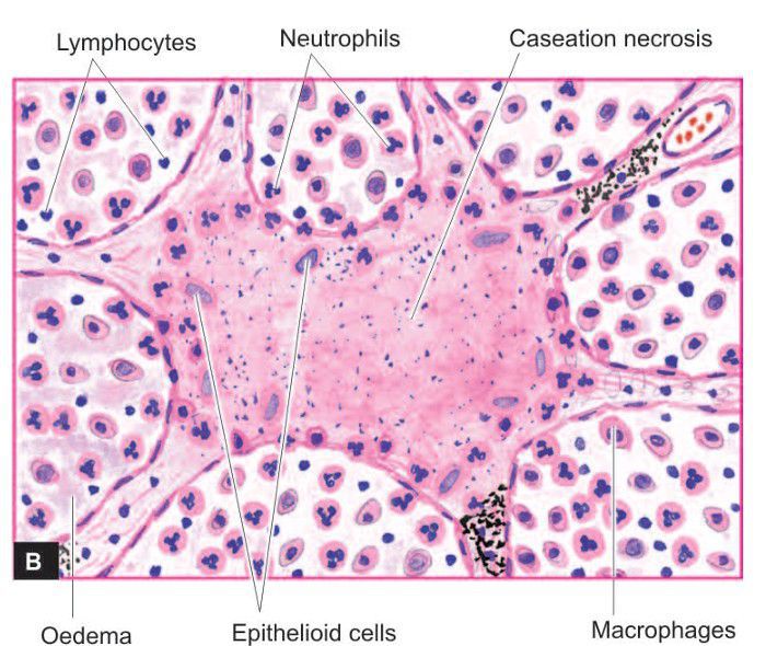 Tuberculous caseous pneumonia showing exudative reaction. In AFB staining, these cases have numerous acid-fast bacilli (not shown)