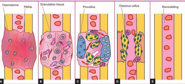 A, Haematoma formation and local inflammatory response at the fracture site. B, Ingrowth of granulation tissue with formation of soft tissue callus. C, Formation of procallus composed of woven bone and cartilage with its characteristic fusiform appearance and having 3 arbitrary components—external, intermediate and internal callus. D, Formation of osseous callus composed of lamellar bone following clearance of woven bone and cartilage. E, Remodelled bone ends; the external callus cleared away. Intermediate callus converted into lamellar bone and internal callus developing bone marrow cavity.