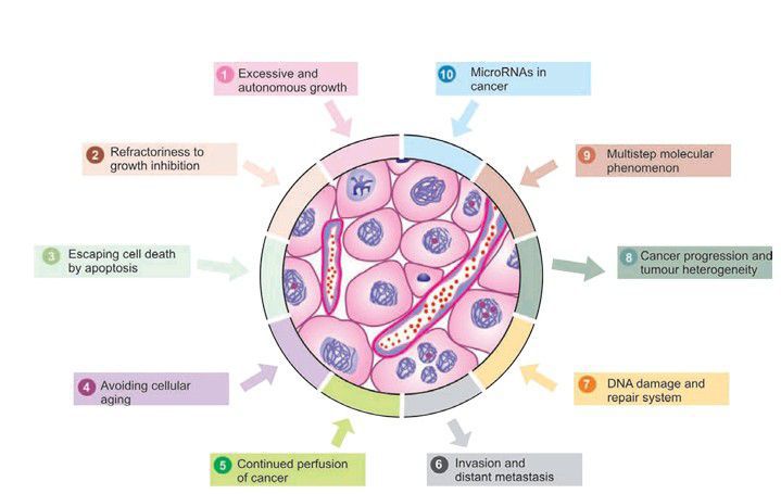 Schematic representation of major properties of cancer in terms of molecular carcinogenesis.