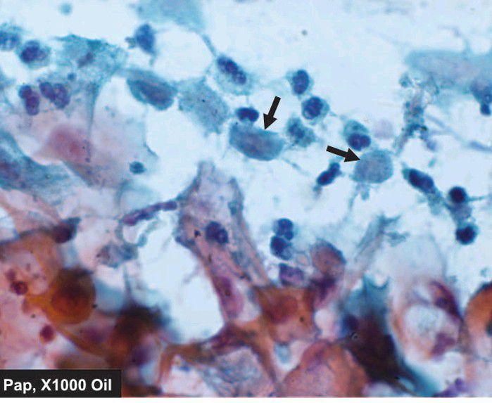 Trichomonas in inflammatory smear (arrow).