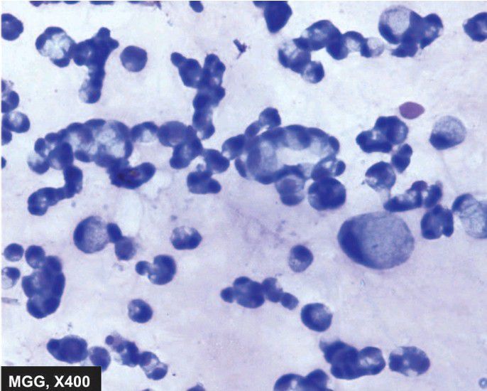 Pleural fluid positive for signet ring cells (adenocarcinoma stomach). There are large number of malignant cells scattered singly or in small clusters having characteristic cytoplasmic vacuoles, nuclear hyperchromasia and prominent nucleoli.