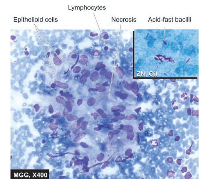 FNA lymph node showing tuberculous lymphadenitis. Inbox shows Ziehl-Neelsen staining having many tubercle bacilli.