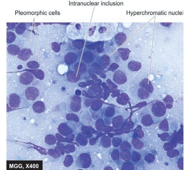 FNA breast showing features of infiltrating ductal carcinoma.