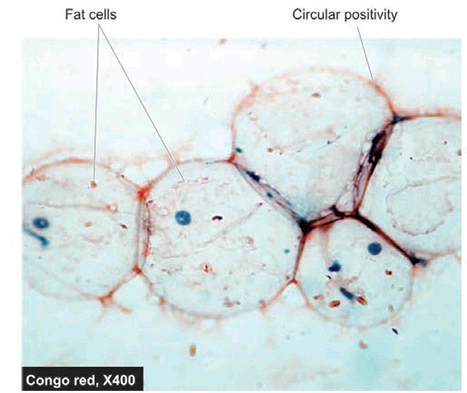 Abdominal fat aspirate stained with Congo red stain For amyloid.