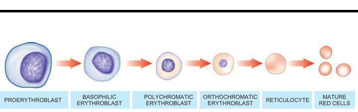 There is progressive condensation of the nuclear chromatin which is eventually extruded from the cell at the late erythroblast stage. The cytoplasm contains progressively less RNA and more haemoglobin.