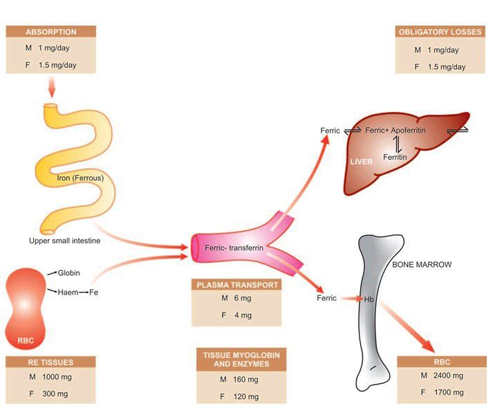 . Iron on absorption from upper small intestine circulates in plasma bound to transferrin and is transported to the bone marrow for utilisation in haemoglobin synthesis. The mature red cells are released into circulation, which on completion of their lifespan of 120 days, die. They are then phagocytosed by RE cells and iron stored as ferritin and haemosiderin. Stored iron is mobilised in response to increased demand and used for haemoglobin synthesis, thus completing the cycle (M = males; F = females).