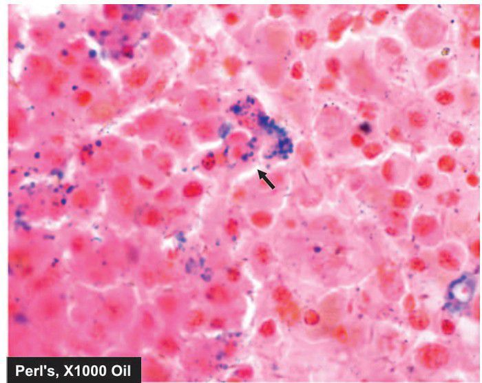 Sideroblastic anaemia bone marrow aspirate smear in Perls’ stain shows marked excess of reticular iron and a ringed sideroblast (arrow) showing Prusian blue granules in the cytoplasm.