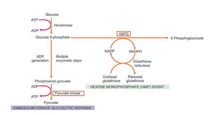 Abbreviated pathways of anaerobic glycolysis (Embden-Meyerhof) and hexose monophosphate (HMP) shunt in the metabolism of erythrocyte. The two red cell enzyme defects, glucose-6 phosphate dehydrogenase (G6PD) and pyruvate kinase, are shown bold.