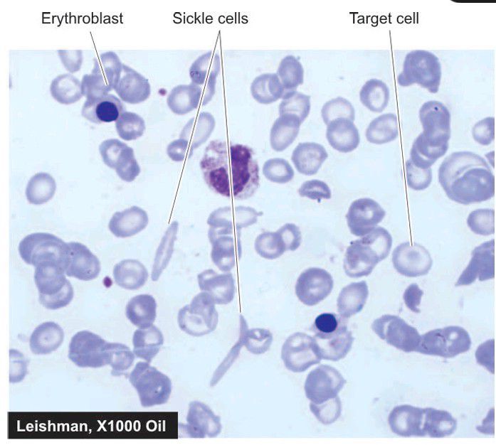 Sickle cell anaemia. PBF shows crescent shaped elongated red blood cells, a few target cells and a few erythroblasts.