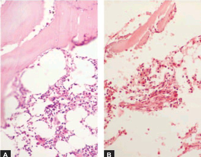 Bone marrow trephine biopsy in aplastic anaemia contrasted against normal cellular marrow. A, normal marrow biopsy shows about 50% fatty spaces and about 50% is haematopoietic marrow which contains a heterogeneous mixture of myeloid, erythroid and lymphoid cells. B, In aplastic anaemia, the biopsy shows suppression of myeloid and erythroid cells and replacement of haematopoetic elements by fat. There are scanty foci of cellular components composed chiefly of lymphoid cells.