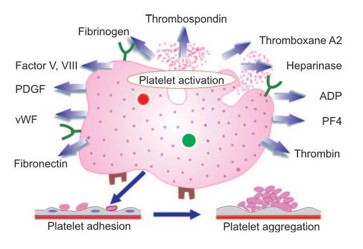 Main events in primary haemostasis—platelet adhesion, release (activation) and aggregation.
