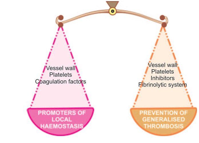 Formation of haemostatic plug is a complex mechanism and involves maintenance of a delicate balance among at least 5 components (i) blood vessel wall; (ii) platelets; (iii) plasma coagulation factors; (iv) inhibitors; and (v) fibrinolytic system.