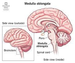 The medulla oblongata is the connection between the brainstem and the spinal cord, carrying multiple important functional centers. It is comprised of the cardiovascular-respiratory regulation system, descending motor tracts, ascending sensory tracts, and origin of cranial nerves IX, X, XI, and XII.