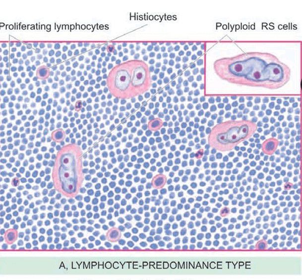 Microscopic features of Lymphocyte-predominance forms of Hodgkin’s disease of lymph node. The inset on right side of each type shows the morphologic variant of RS cell seen more often in particular histologic type.