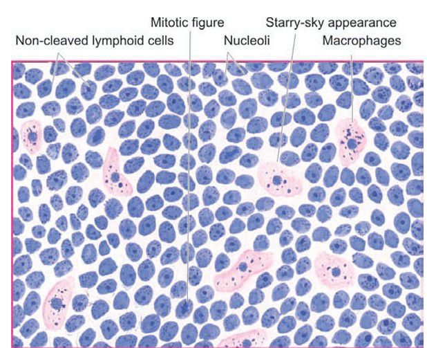 The tumour shows uniform cells having high mitotic rate. Scattered among the tumour cells are benign macrophages surrounded by a clear space giving ‘starry sky’ appearance.
