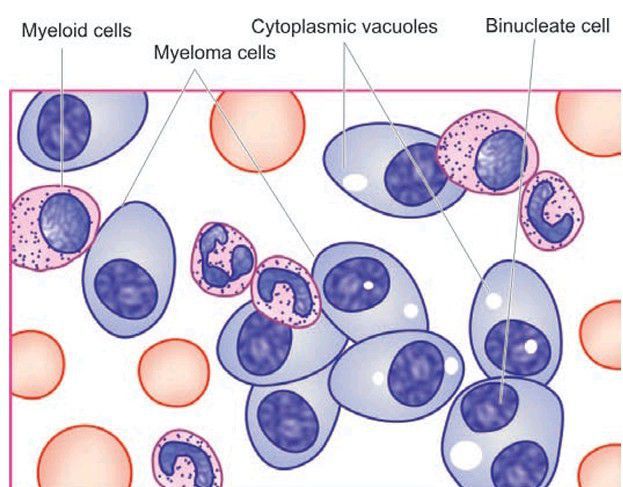 Bone marrow aspirate in myeloma showing numerous plasma cells, many with abnormal features.