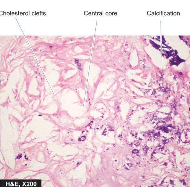 Complicated atheromatous plaque lesion. There is narrowing of the lumen of coronary due to fully developed atheromatous plaque which has dystrophic calcification in its core.