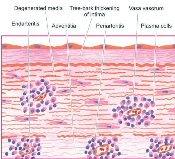 Syphilitic aortitis. There is endarteritis and periarteritis of the vasa vasorum in the media and adventitia. There is perivascular infiltrate of plasma cells, lymphocytes and macrophages.