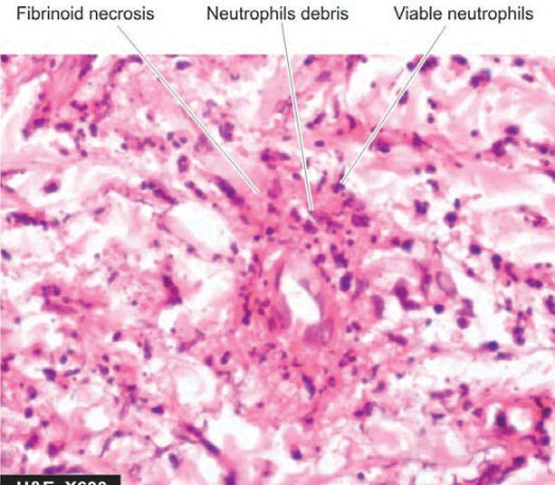 . The vessel wall shows fibrinoid necrosis surrounded by viable as well as fragmented neutrophils.