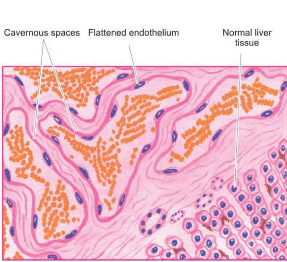 Cavernous haemangioma of the liver. The vascular spaces are large, dilated, many containing blood, and are lined by flattened endothelial cells. Scanty connective tissue stroma is seen between the cavernous spaces.