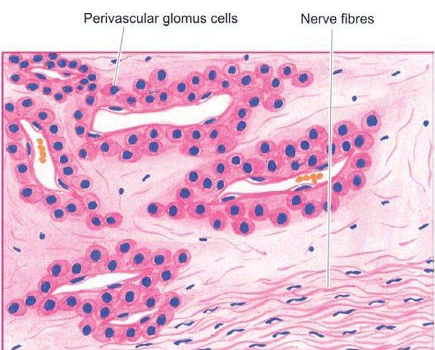 . There are blood-filled vascular channels lined by endothelial cells and surrounded by nests and masses of CHAPTER 15 The Blood Vessels and Lymphatics glomus cells.