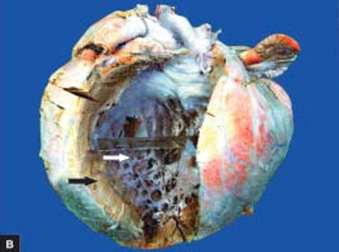 The heart is heavier. The free left ventricular wall is thickened (black arrow) while the lumen is dilated (white arrow) (hypertrophy with dilatation).
