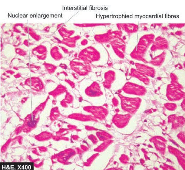 . Individual myocardial fibres are thick with prominent vesicular nuclei.