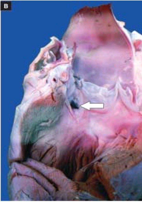 Schematic representation (LA = Left atrium; LV = Left ventricle; AO = Aorta; PV = Pulmonary valve; PT = Pulmonary trunk; RA = Right atrium; RV = Right ventricle; SVC = Superior vena cava; IVC = Inferior vena cava). The opened up chambers of the heart show a communication in the inter-ventricular septum superiorly (white arrow).