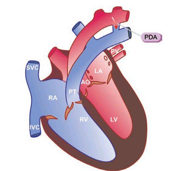 Patent ductus arteriosus, a schematic representation (LA = Left atrium; LV = Left ventricle; PT = Pulmonary trunk; PV = Pulmonary vein, AO = Aorta; RA = Right atrium; RV = Right ventricle; SVC = Superior vena cava; IVC = Inferior vena cava).