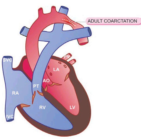 Postductal or adult type coarctation of the aorta, a schematic representation (LA = Left atrium; LV = Left ventricle; PT = Pulmonary trunk; PV = Pulmonary vein; AO = Aorta; RA = Right atrium; RV = Right ventricle; SVC = Superior vena cava; IVC = Inferior vena cava).