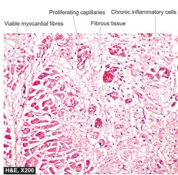 . The infarcted area shows ingrowth of inflammatory granulation tissue