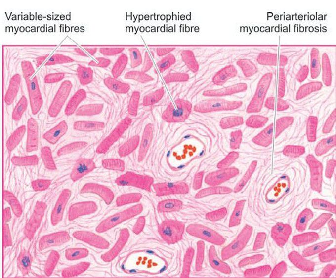 There is patchy myocardial fibrosis, especially around small blood vessels in the interstitium. The intervening single cells and groups of myocardial cells show myocytolysis.