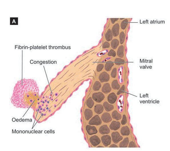 Microscopic structure of the rheumatic valvulitis and a vegetation on the cusp of mitral valve in sagittal section.
