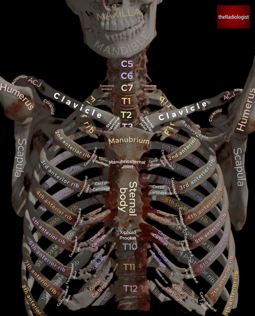 Have a look at this 3D reconstruction of the bones from a CT thorax and swipe left to compare this to how we see these structures on a Chest X-Ray Let’s have a think about the sternum: it is made up of three parts 1️⃣Manubrium: contains two clavicles notches and articulates with the medial end of each clavicle at the sternoclavicular joint 2️⃣Body: contains facets on its lateral borders to articulate with the costal cartilage of the 3rd-7th rib. Articulates with the second rib at the sternal angle 3️⃣Xiphoid process: has a variable shape Sternal fractures can result from blunt anterior chest wall trauma and deceleration injuries. These are not well seen on frontal X-Ray but we are picking more and more up on trauma CT scans. When reviewing on a sagittal view, the sternum is always a key review area for me as fractures can be difficult to appreciate on axial views.