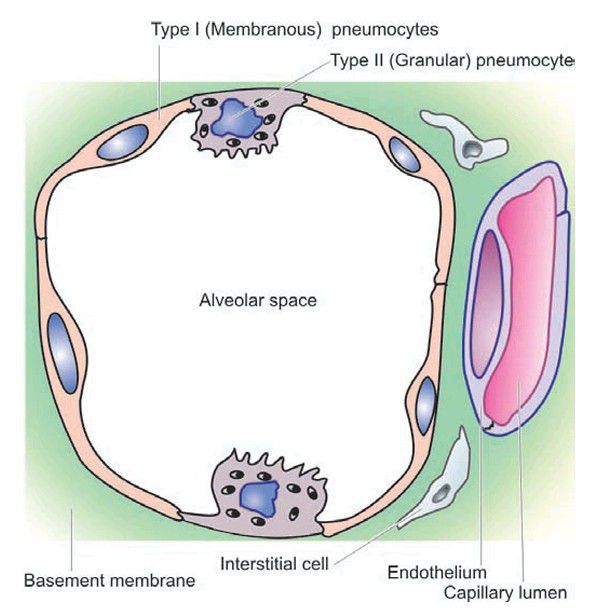 Histologic structure of alveolar wall (alveolar septa). It shows capillary endothelium, capillary basement membrane and scanty interstitial tissue and the alveolar lining cells (type I or membranous pneumocytes and type II or granular pneumocytes).