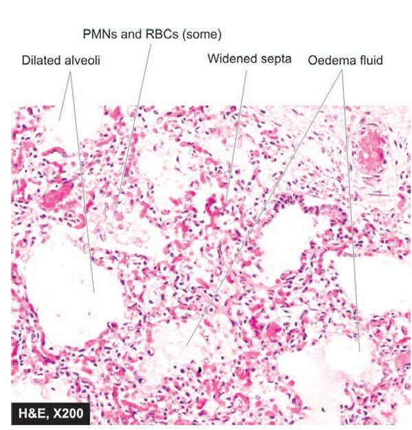 Lobar pneumonia, acute congestion stage. There is congestion of septal walls while the air spaces contain pale oedema fluid and a few red cells.