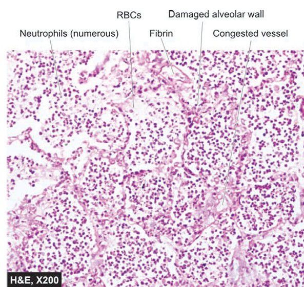 Lobar pneumonia, red hepatisation stage. The alveoli are filled with cellular exudates composed of neutrophils admixed with some red cells.