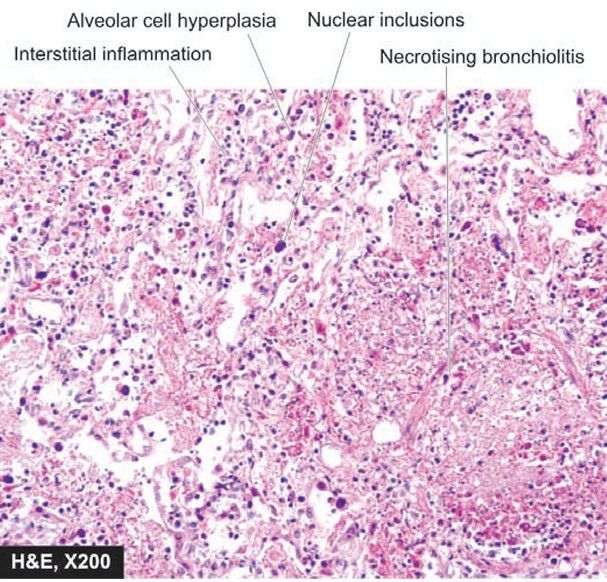Microscopic appearance of interstitial pneumonitis (viral pneumonia). There is necrotising bronchiolitis, reactive hyperplasia of alveolar epithelial cells, some having nuclear inclusions, and there is interstitial inflammation.