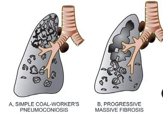 Gross appearance of the lungs in simple coal-workers’ pneumoconiosis (A) and progressive massive fibrosis (B).