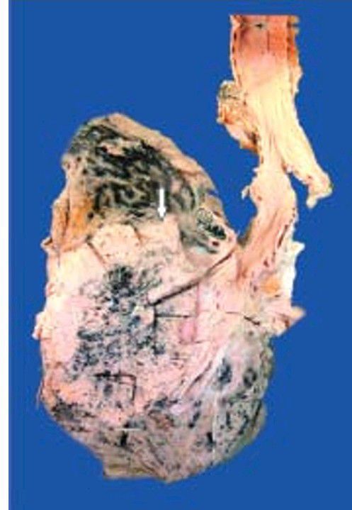 Squamous cell carcinoma lung, hilar type. Sectioned surface shows grey-white fleshy tumour in the bronchus at its bifurcation and occluding the lumen partly (arrow). The tumour is seen extending directly into adjacent lung parenchyma and hilar nodes.