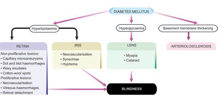 Schematic diagram showing the effects of diabetes mellitus on eye in causing blindness.