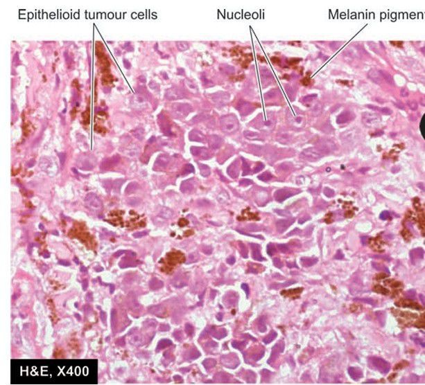 . The tumour cells are epithelioid in appearance having prominent nucleoli and contain black finely granular melanin pigment in the cytoplasm.