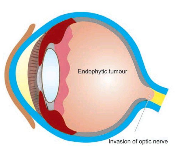 Retinoblastoma, showing white mass growing extensively within the posterior part of the eye.