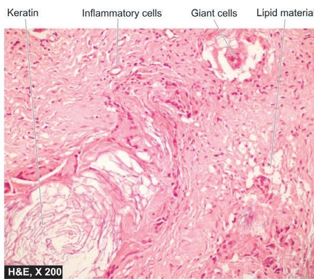 There is chronic inflammatory granulation tissue and foreign body giant cells around the cholesterol clefts and some pink keratinous material.