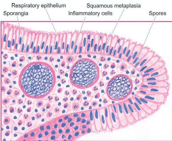 Rhinosporidiosis in a nasal polyp.