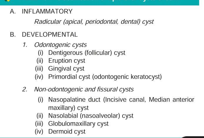 The epithelium-lined cysts of dental tissue can have inflammatory or developmental origin.