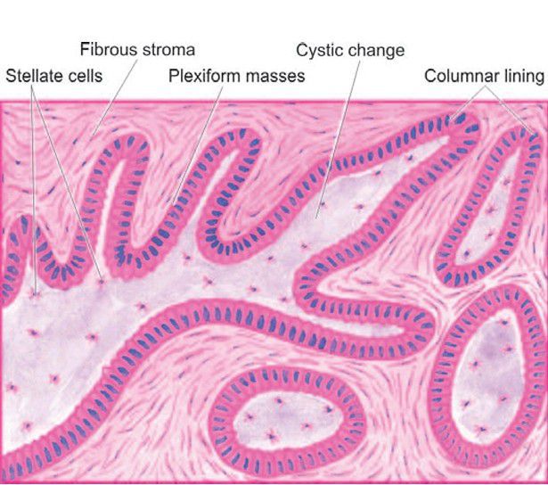Ameloblastoma, follicular and plexiform patterns. Epithelial follicles are composed of central area of stellate cells and peripheral layer of cuboidal or columnar cells. Plexiform areas show irregular plexiform masses and network of strands of epithelial cells. A few areas show central cystic change.