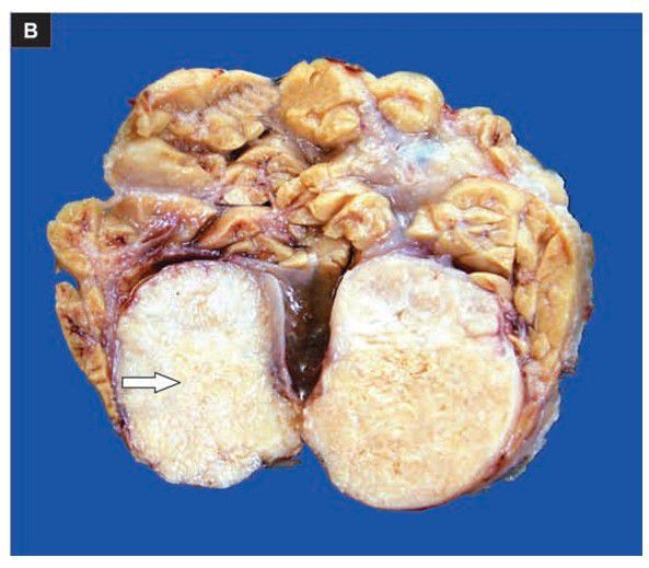 Sectioned surface of the parotid gland shows lobules of grey-white circumscribed tumour having semitranslucent parenchyma (arrow).