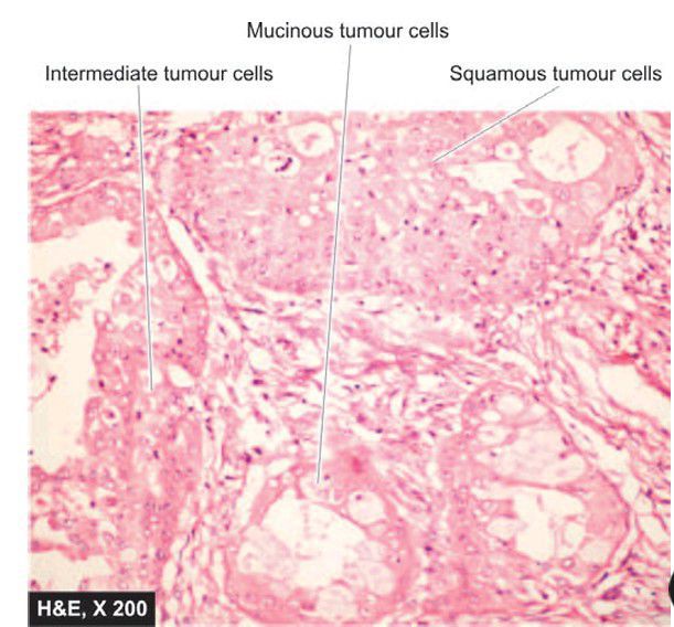 The tumour shows combination of mucinous, squamous and intermediate cells and having infiltrative border.