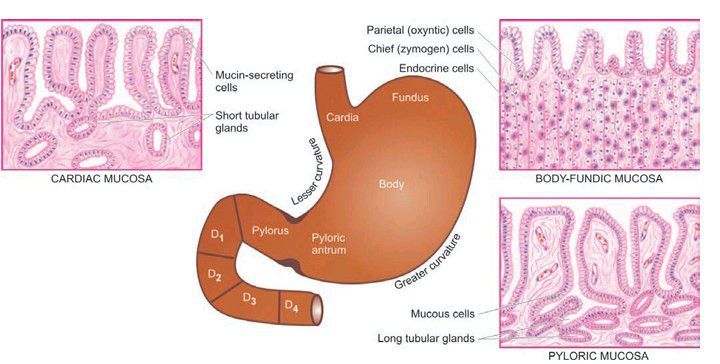 Anatomical subdivisions of the stomach correlated with histological appearance of gastric mucosa in different regions. D1, D2, D3 and D4 are the first to fourth parts of the duodenum.